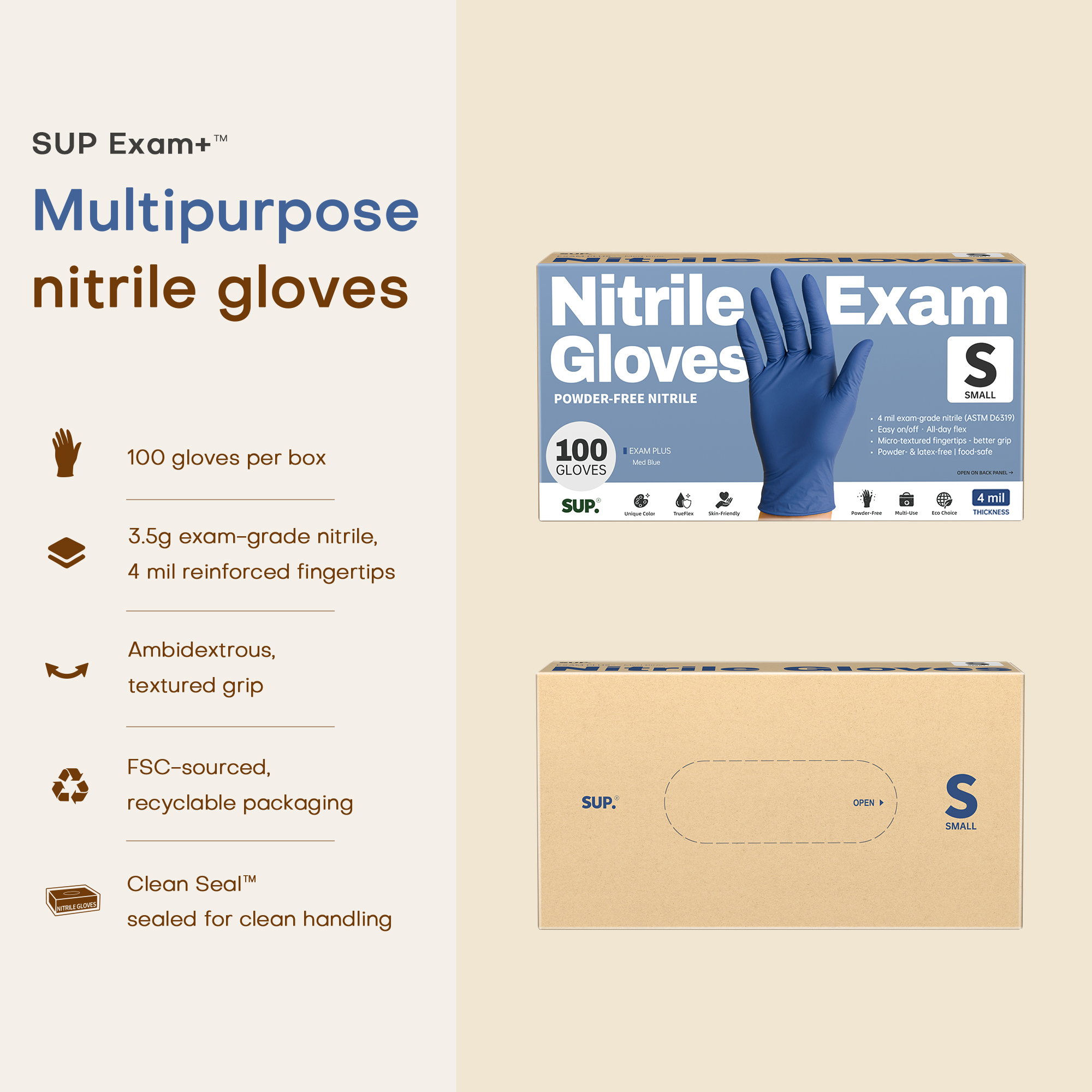 SUP MED Blue™ Examination Nitrile Gloves, Powder Free Medical Disposable Gloves, Box of 100 pcs