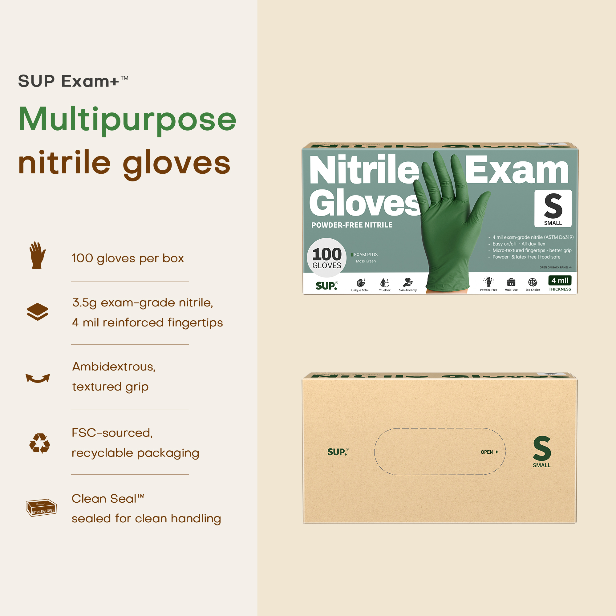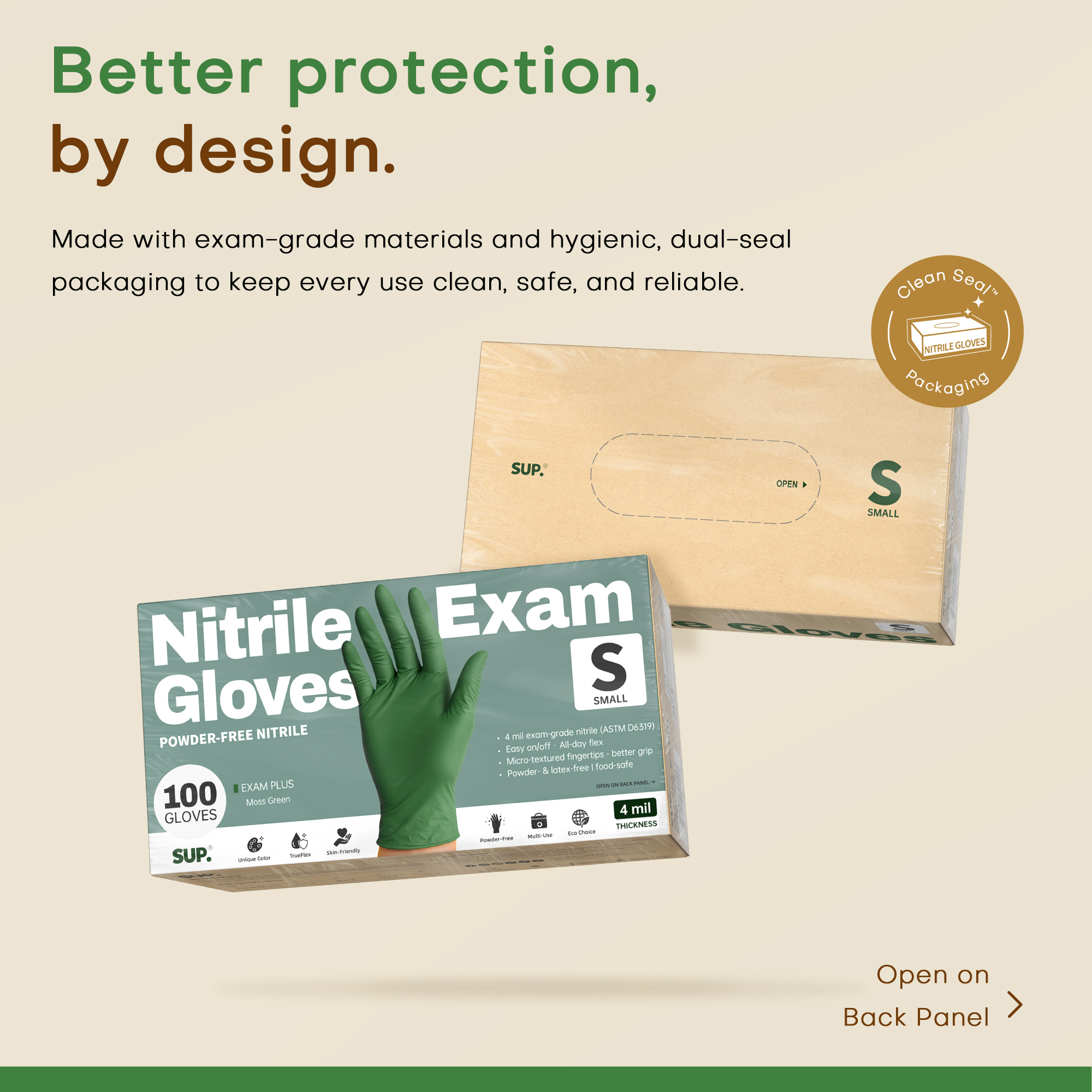 SUP Moss Green™ Examination Nitrile Gloves, Powder Free Medical Disposable Gloves, Box of 100 pcs